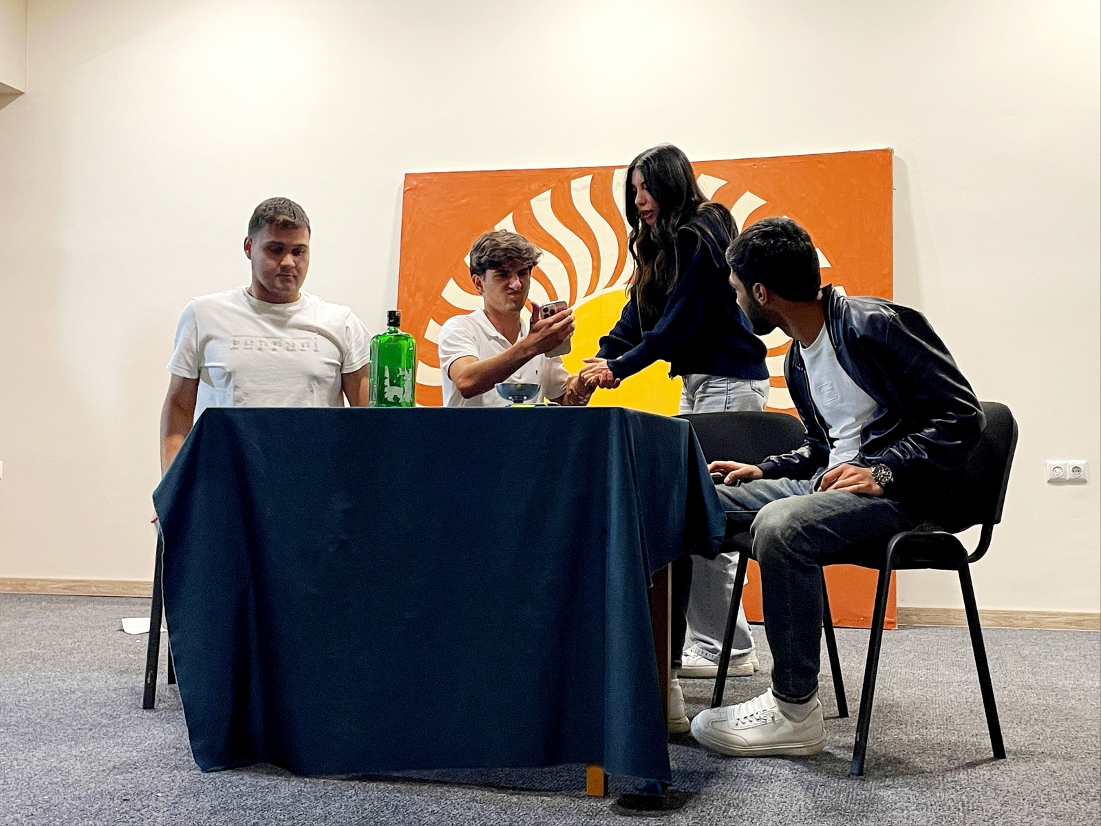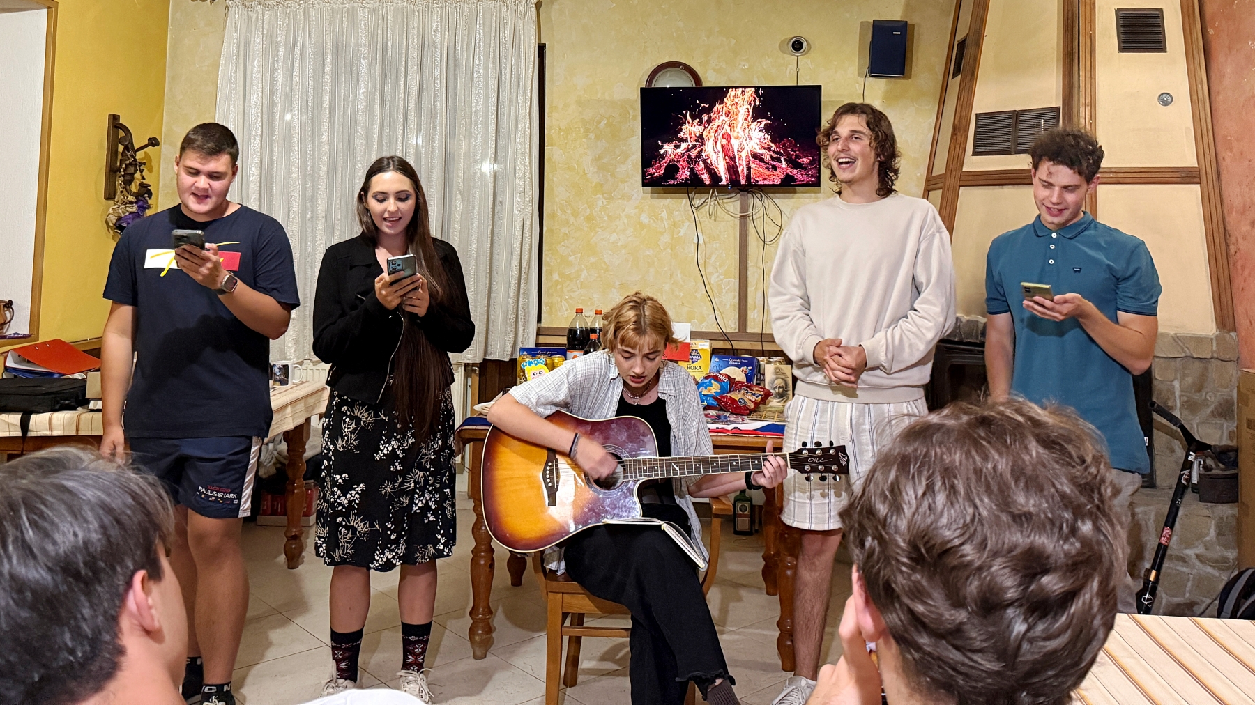 The second week was all about creating our theatre plays. Firstly, we split into four groups (4–5 people per group) according to the genre of our future works: comedy, tragicomedy, drama, and musical. We were about to spend the rest of our time of the “working hours” of the Erasmus with these people. And then the work began! The first step was to think of the main theme and plot, so we all went to brainstorm with our group right away. Then we had to write down the script, which had to include not only the dialogue but also some notes regarding the settings and the positioning of the characters. For some, this was the most challenging part, for it was needed to flesh out the main idea in details. Other groups were working with elements of improvisation and detailed script wasn’t of such a concern to them. When the script was finished (or at least half-finished), rehearsals could start taking place. We also needed to make a list of props, find the music and sound effects we wanted to use, optionally create a choreography for the dances, and, in the case of the musical, write down our own songs and record the accompaniment for them. With each rehearsal we found out what needs to be altered and improved and we were doing so until there was no more time left. The organisers were regularly giving us tips and feedback on the progress we made, they were helping us with finding solutions to some tricky situations we found ourselves in, they gathered all the props for us, and made sure that we will be able to finish our plays in time for the final performance.