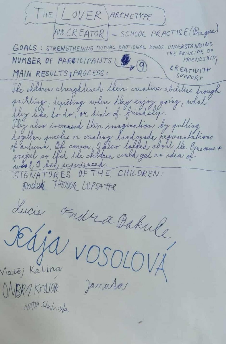 Každý národní tým byl zodpovědný za vedení jednoho z programů, resp. jednoho z archetypů – program byl vždy dobře propracovaný, a byl vždy zohledněn podle aktuálních potřeb, energie, nálady ve skupině a psychické pohody účastníků. Český tým zorganizoval aktivitu pro den Tvůrce, kdy jsme si krátce zameditovali, zamysleli jsme se, prošli se v lese k načerpání energie a inspirace a vytvořili si vlastní talisman – předmět, který nám bude napomáhat k hledání a směrování vlastní cesty životem.