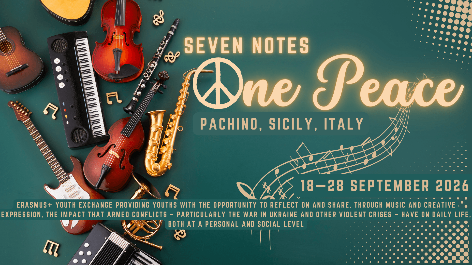We chose this name because expresses the possibility of using just 7 notes in order to discuss about a topic that involve several others. The cooperation of 25 young people to create a tangible result (a music album) helping their organisation to process the negatives experiences of the last years marked by International conflicts, giving voice to young people on this topic and provide their point of view on this political issue. Seven Notes, One Peace wants to achieve that through music language. This leads to non-formal education activities based on jam session, songwriting workshop, concerts and recording an album during this Youth Exchange.
