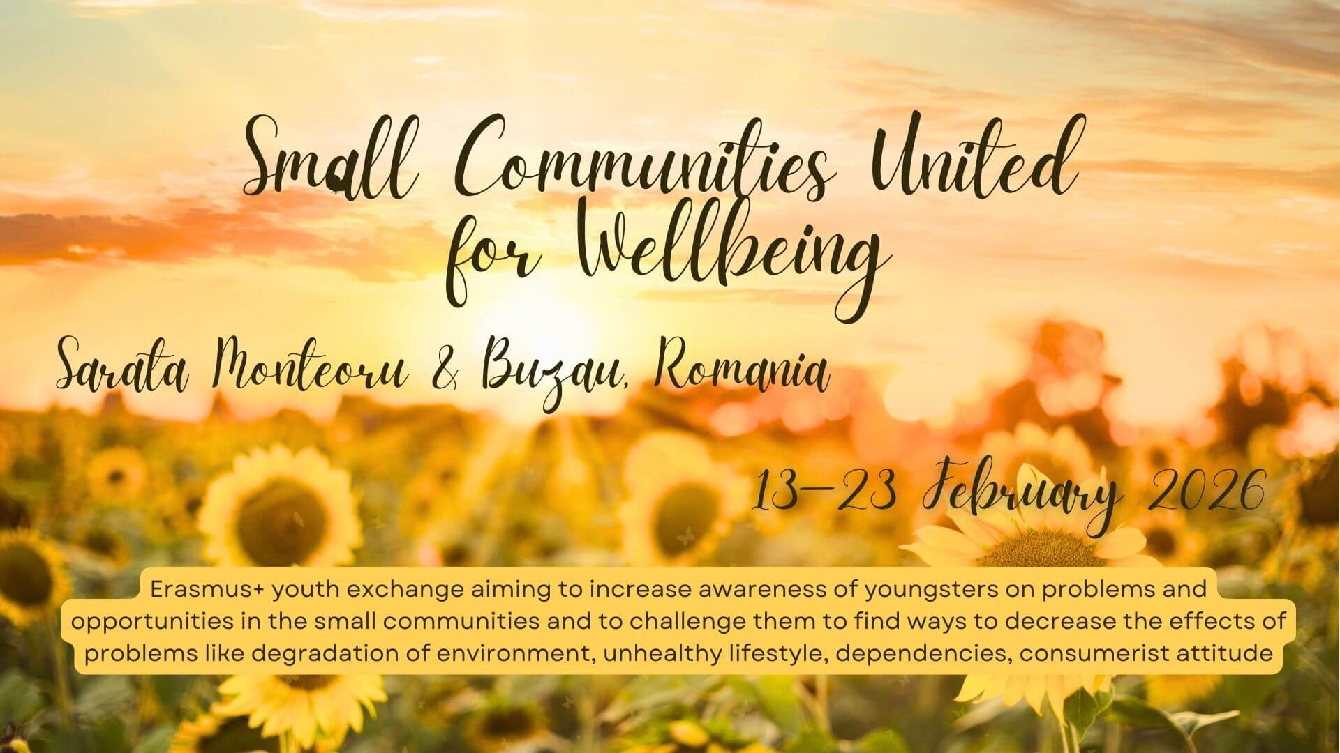 „SMALL COMMUNITIES UNITED FOR WELL-BEING” is a YOUTH EXCHANGE that will take place in Sarata Monteoru and Buzau, Romania between 13 and 23 February 2026 with 44 participants from 8 countries